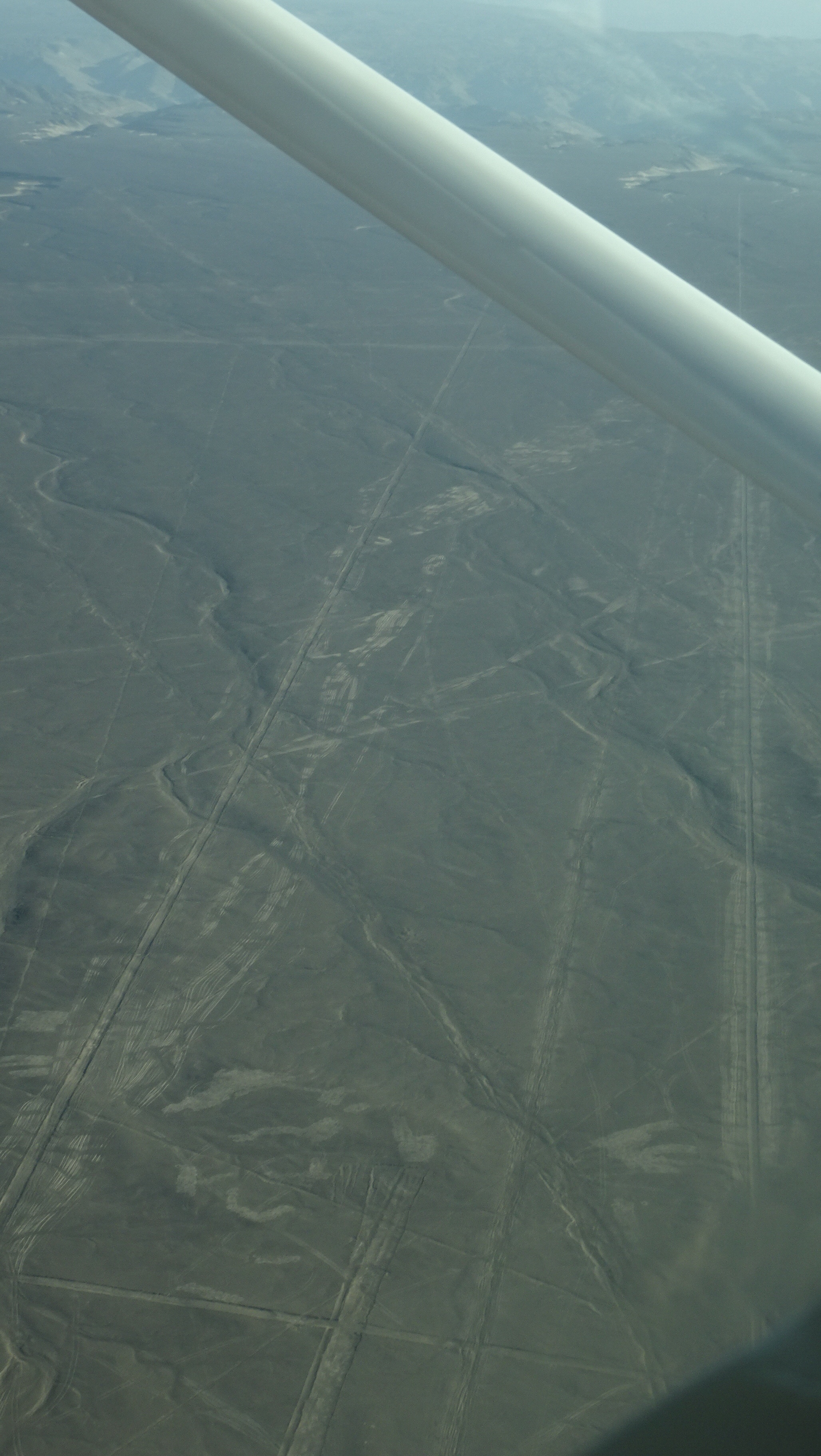Men mest känd är Nasca- kulturen inte för sina vävnader ändå, utan för Nasca-linjerna, spikraka kilometerlånga, påfågel, apa och en rad figurer i jätteformat varav många bara kan ses från ett flygplan. Nasca-linjerna. Googla igen.’