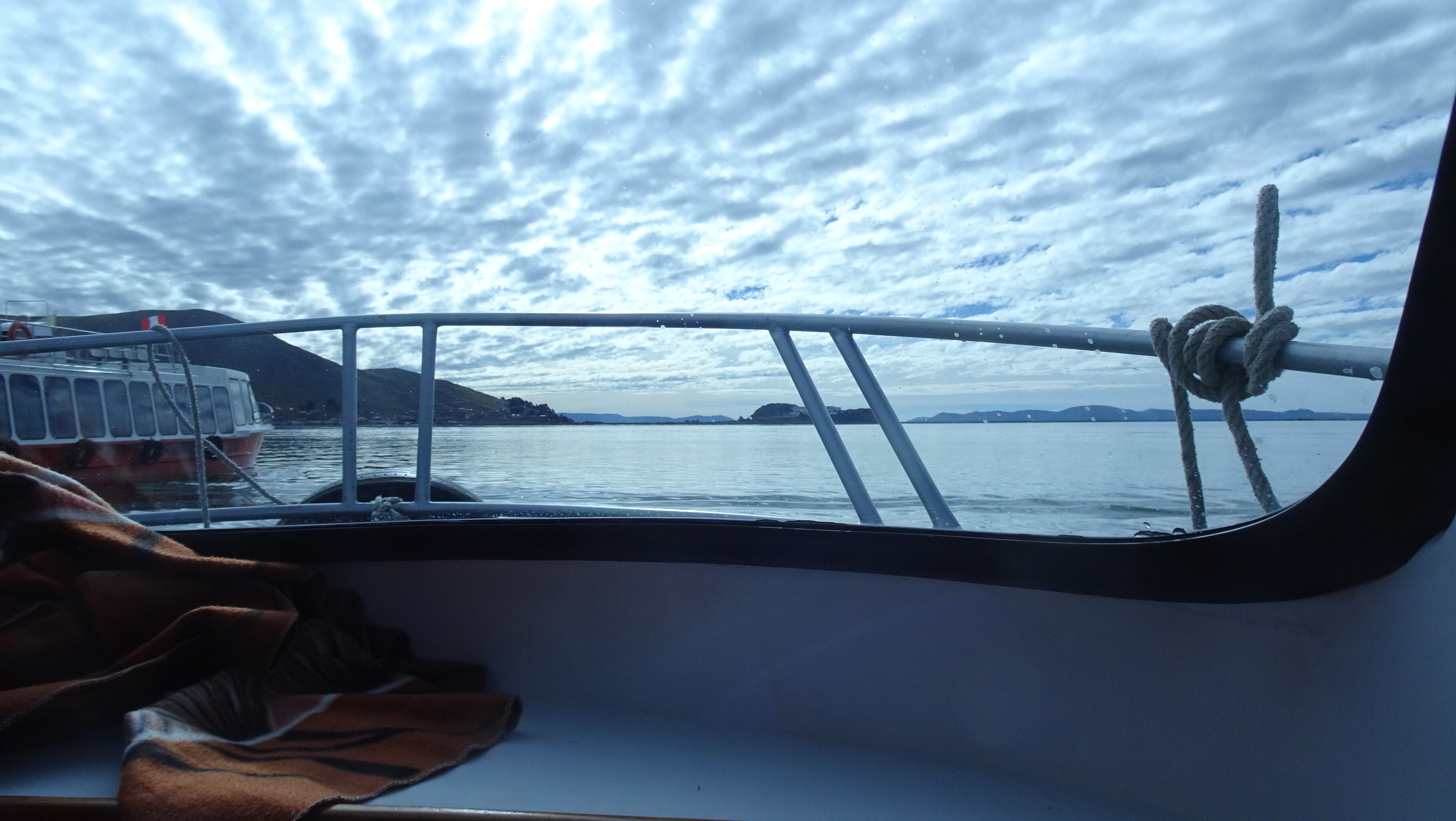 Tar mig tid att skriva lite mitt på dagen. Kortet är taget framme i fören på den båt som i sakta mak tar oss mot ön Amantani, i Titikaka- sjön.